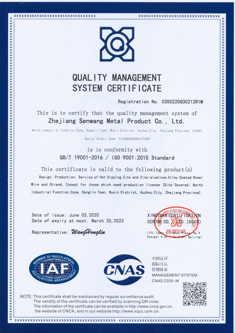 浙江森旺金屬制品有限公司成立于2012年,坐落湖州市吳興區東林鎮工業功能區。公司專業從事各類鍍鋅鋼絲、鋼絞線等產品的開發及生產。目前產品已廣泛應用于各類通信光電纜,電力輸送,電氣化鐵路工程,各類堤壩防護及農業溫室等工程領域。公司秉承“追求卓越品質,創建卓著信譽”的經營理念,始終堅持專業化、規?;慕洜I模式。